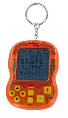 Sudoku To Go! Popular Handheld Sudoku Key Ring GameProduct InformationAre you looking for something to do while waiting in the airporttraveling in a vehicle in line at the grocery store or some place you need topass time? The SuDoku Key Ring is ideal for those on the go! It'sfun addictive and great for all ages. It features four skill levels andfour puzzle grids with over 1000 puzzles! A puzzle of pure logic no mathskills required! Best of all...no need to carry a Sodoku book or writingutensil.Sudoku is a challenging logic game that's easy to learn. Like a crosswordpuzzle without words the premise is simple: fill in the missing numbers in apuzzle grid so that every horizontal row vertical column and 3x3 squarecontains each number from 1 to 9 without repeats. The game uses numbersbut there are no calculations. Mathematicians have absolutely noadvantage; it's all about problem solving logic reason and critical thinkingskills - all the elements that make great puzzles so much fun!Product Features Colors May Vary Over 1000 Puzzles Compact and lightweight Simply challenging 4 Way Directional Key Pad 4 Puzzle Grids 4x4 6x6 8x8 9x9 Fun and Addictive 3 Difficulty Levels for Each Grid Selection Easy Medium Hard 2 Game Modes Demo/Settings Game Play Adjustable LCD Contrast Sound On/Off Low Battery Indicator No Math Skills Required Minimum Requirements Requires 2 LR44 batteries (included)